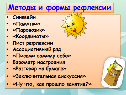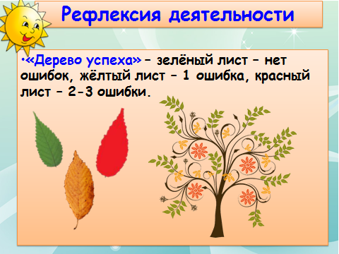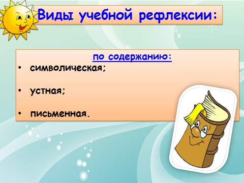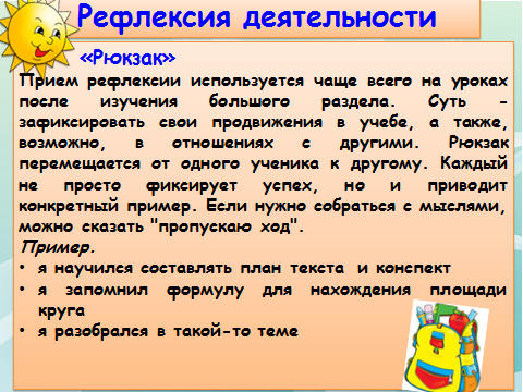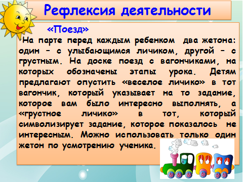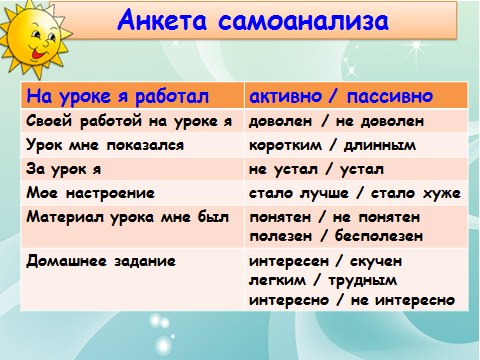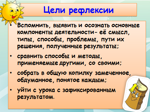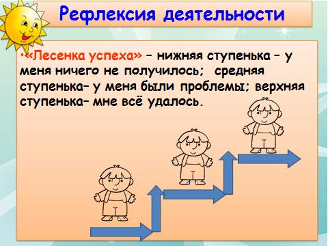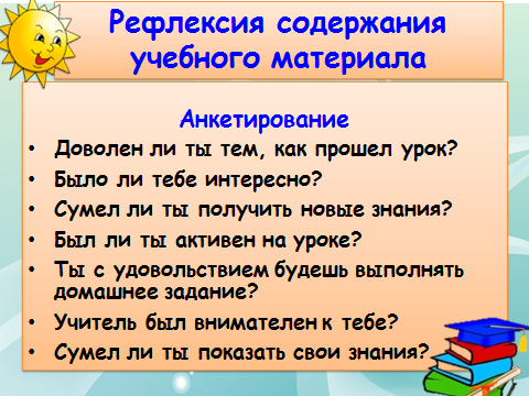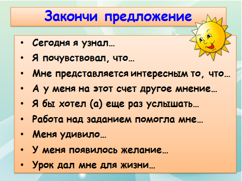 Вот этот тип рефлексии удобнее проводить в конце урока или на этапе подведения итогов. Он дает возможность детям осознать содержание пройденного, оценить эффективность собственной работы на уроке.