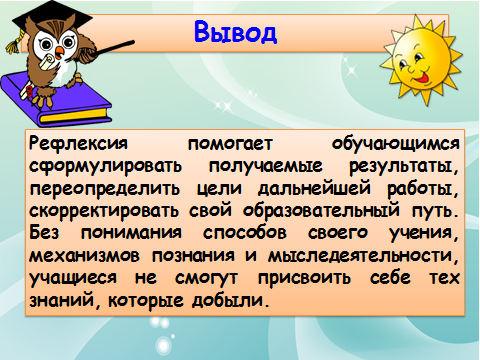 Перечислять приёмы рефлексии можно бесконечно, но в заключении мне хотелось бы сказать, что, рефлексия – это совместная деятельность учащихся и учителя, позволяющая совершенствовать учебный процесс, ориентируясь на личность каждого ученика. Любой человек с радостью делает то, что у него хорошо получается. Но любая деятельность начинается с преодоления трудностей. У рефлексивных людей путь от первых трудностей до первых успехов значительно короче. Всё, что делается на уроке по организации рефлексивной деятельности – не самоцель, а подготовка к развитию очень важных качеств современной личности: самостоятельности, предприимчивости и конкурентоспособности. Слайд №24