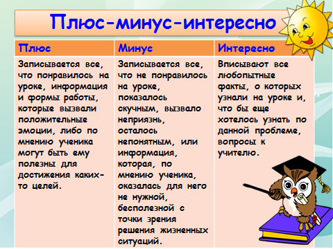 Данный вид рефлексии удобнее применять при проверке домашних заданий, на этапе закрепления материала, при защите проектов. Он помогает ученикам осмыслить виды и способы работы, проанализировать свою активность и, конечно, выявить пробелы.