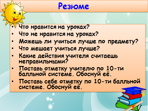 Она оценивает настроение, эмоциональное восприятие учебного материала. Это рефлексия из категории "понравилось / не понравилось", "интересно / скучно", "было весело / грустно". Данный вид рефлексии помогает учителю оценить общее настроение класса. Чем больше позитива, тем лучше понята тема. И наоборот, если условных "тучек" будет больше, значит, урок показался скучным, трудным, возникли сложности с восприятием темы. Согласитесь, нам бывает скучно и грустно, когда мы чего-то не понимаем.