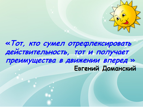 И закончить своё выступление я хочу словами Евгения Доманского (научный сотрудник лаборатории методологии общего среднего образования, автор Научных статей в журналах «Педагогика», «Народное образование») «Тот, кто сумел отрефлексировать действительность, тот и получает преимущества в движении вперед » Слайд №25